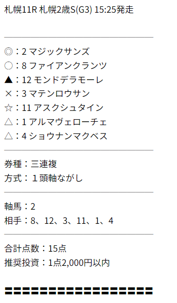 ちょい荒れ札幌2歳ステークス無料でゲット!ってか3鞍3的中でパーフェクト!