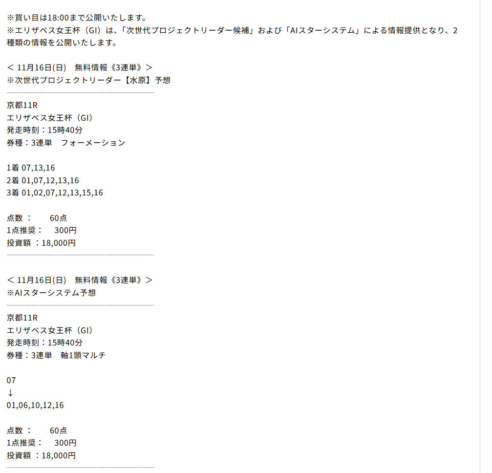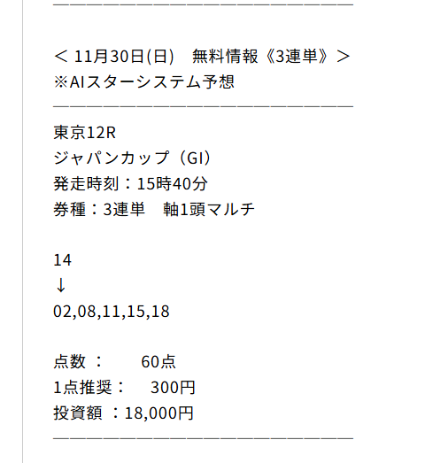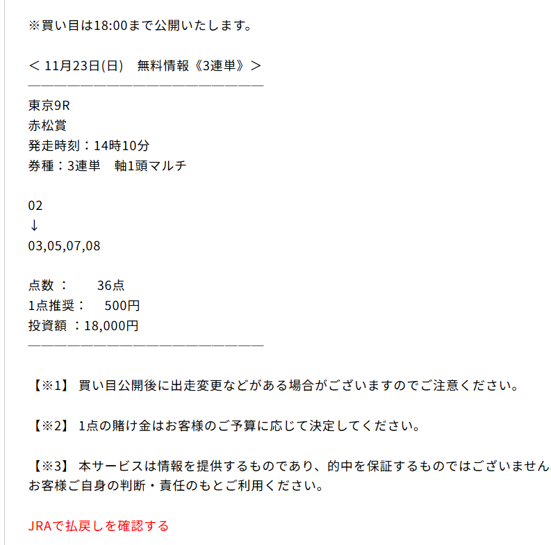 今朝、オススメされた初めだし無料情報から試してみようと思い 公開されていた3連単買い目を推奨通りに馬券購入。 そしたら初回から3連単万馬券(309.6倍)的中いただけました! ビックリしましたがオススメする理由が無料予想からも理解できました。 1点500円で馬券を購入していたので15万4800円! 明日はマイルチャンピオンの予想公開されるみたいなので楽しみに買い目公開を待ちたいと思います。 先週もエリザベス女王杯3連単予想で7万4040円的中させていたのもうなずけます。