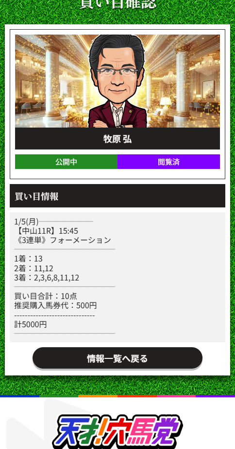 牧原さんの予想凄まじいですね今回も、この日は重賞無かったけど中山メインの サンライズステークス6人気1着固定で3連単180,380円(548番人気)を3連単たったの10点!しかも馬券代5千円で超特大ホームラン! 有馬記念の大敗、京都金杯大負けもしっかりここで取り返し90万1900円ゲット!